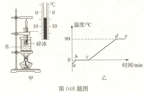 048. 图甲中,试管中装有适量碎冰,用酒精灯对烧杯中足量的水进行加热,用温度计测量不同时刻的温度值,温度随时间变化的图像如图乙所示。