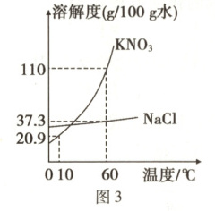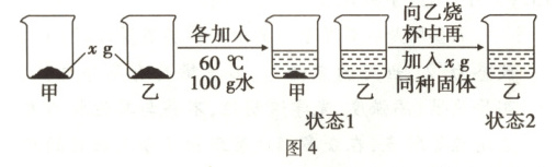 已知图 3 是 NaCl 和 KNO₃ 的溶解度信息。在 60℃时,分别取$x$ g NaCl 和 KNO₃ 固体进行如图 4 的实验,每步均充分溶解,现象如图所示。