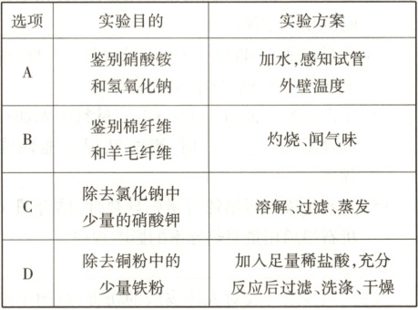 10.C [解析]A.加水,感知试管外壁温度,溶于水温度降低的是硝酸铵固体,溶于水温度升高的是氢氧化钠固体,可以鉴别,故选项实验方案正确;B.灼烧、闻气味,产生烧焦羽毛的气味的是羊毛纤维,产生烧纸气味的是棉纤维,可以鉴别,故选项实验方案正确;C.氯化钠和硝酸钾都易溶于水,除去氯化钠中混有少量的硝酸钾,不能采用溶解、过滤、蒸发的方法,故选项实验方案错误;D.加入足量稀盐酸,铁粉能与足量稀盐酸反应生成氯化亚铁溶液和氢气,铜粉不能与稀盐酸反应,充分反应后过滤、洗涤、干燥,能除去杂质且没有引入新的杂质,符合除杂原则,故选项实验方案正确。故选C。