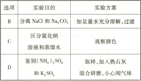 10.D [解析]A.澄清石灰水能够吸收二氧化碳,不能吸收氧气,因此不能除去氧气,反而除去了二氧化碳,故A错误;B.氯化钠和碳酸钠都是易溶于水的物质,加足量水充分溶解,过滤得到的是氯化钠和碳酸钠的混合溶液,故B错误;C.氯化钠溶液和蒸馏水都是无色液体,通过观察颜色不能区分两种物质,故C错误;D.氢氧化钙和硫酸铵反应生成硫酸钙、水和氨气,产生刺激性气味,硫酸钾和氢氧化钙不能反应,不产生刺激性气味,能够区分两种物质,故D正确。故选D。