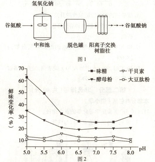 。(2)图 1 中和池中发生的反应为 $C_{5}H_{9}NO_{4} + NaOH\xlongequal{}C_{5}H_{8}NO_{4}Na + H_{2}O$,若将氢氧化钠换成碳酸钠也可以获得谷氨酸钠,则反应的化学方程式为
