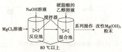 研究发现,将Mg(OH)₂粉末直接与塑料掺混会出现分散性差、相容性低等问题。科研人员用硬脂酸对Mg(OH)₂粉末进行覆盖等处理,制成改性Mg(OH)₂后再掺入塑料,可改善上述问题。这种改性Mg(OH)₂粉末制备的相关流程如图所示。该制备方法为进一步推动Mg(OH)₂阻燃剂的工业化生产和应用提供了可行路径。(资料:常温下硬脂酸为固体,熔点是71℃,微溶于水,其在水和乙醇中均显酸性)
