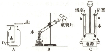 (2) C实验进行一段时间后,a管和b管收集的气体体积比约为______,该反应的化学方程式为______。将燃着的木条靠近a管尖嘴处,打开活塞,观察到______。