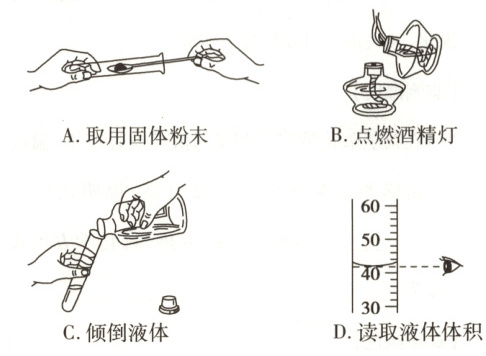 7.B 【解析】A.取用粉末状药品,试管倾斜(或平放),用药匙或纸槽把药品送到试管底部,然后使试管直立起来,故选项A实验操作正确;B.使用酒精灯时要注意“两查、两禁、一不可”,禁止用酒精灯去引燃另一只酒精灯,故选项B实验操作错误;C.向试管中倾倒液体药品时,瓶塞要倒放,标签要对准手心,瓶口紧挨试管口,故选项C实验操作正确;D.量取液体读数时,视线要与量筒内液体的凹液面的最低处保持水平,故选项D实验操作正确。故选B。