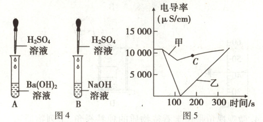 小组同学根据图 4 进行相关实验,利用电导率传感器分别测试 A、B 试管反应过程中溶液的电导率变化。(已知电导率越大,溶液中自由移动的离子浓度越大)