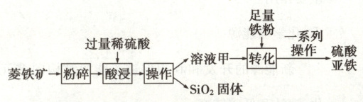 硫酸亚铁广泛用于医学、农业等领域,可利用菱铁矿进行制备。菱铁矿的主要成分是碳酸亚铁($FeCO_{3}$),还含有少量的二氧化硅($SiO_{2}$)和氧化铁($Fe_{2}O_{3}$)。以菱铁矿为原料制备硫酸亚铁的工艺流程如下图所示。