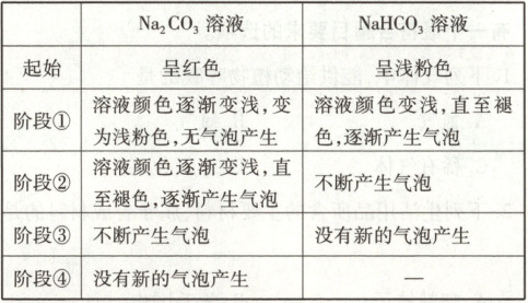 用乙装置进行实验。该装置能将盐酸极缓慢地加入 $Na_{2}CO_{3}$ 溶液、$NaHCO_{3}$ 溶液(它们的体积、含碳元素质量相同)中,并通过磁力搅拌使溶液迅速扩散。向 $Na_{2}CO_{3}$ 溶液和 $NaHCO_{3}$ 溶液中各滴加 2 滴酚酞溶液,并采用延时技术将 1 h 的实验过程压缩到 34 s,使短时间内看到快速连续的变化。最后,按时间顺序连续记录不同阶段的现象,结果如下:
