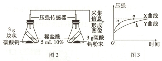 (2)同学们利用图 2 数字化实验比较块状和粉末状碳酸钙与稀盐酸反应的速率,反应发生后,锥形瓶内压强的变化如图 3 所示。