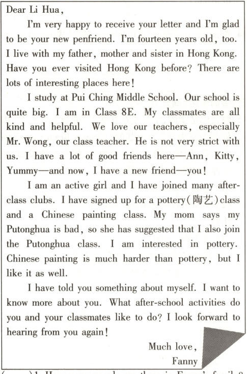 [语篇导读] 本文是Fanny写给李华的信,介绍自己的家庭、学校生活、兴趣爱好。信中表达对新笔友的期待,并询问对方课外活动情况,展现跨地域青少年交流的热情。
