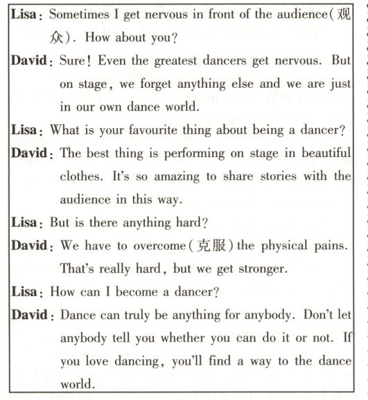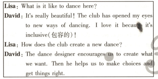 Lisa visited a dance club. She saw disabled (残疾的) and non - disabled people dance together there. Lisa liked it so much that she even joined in their training. After that, she talked with David, a dancer in the club, about the happiness of dancing.