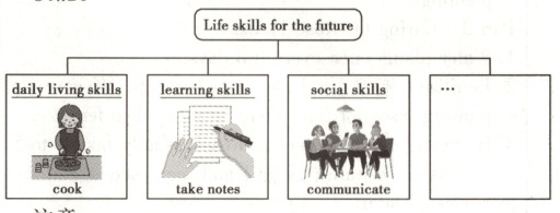 [Life skills for the future结构图,左侧daily living skills下方有cook图标,中间learning skills下方有take notes图标,右侧social skills下方有communicate图标。]