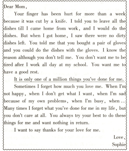 [语篇导读] 本文是Sophie写给妈妈的一封信,信中表达对妈妈的爱和感激。