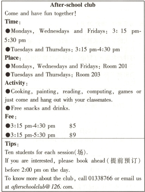 [语篇导读] 本文是一篇应用文,主要介绍了学校课外俱乐部的相关信息。