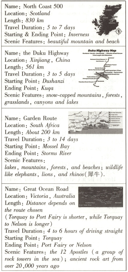 [语篇导读] 本文主要介绍了四个最佳自驾游路线。