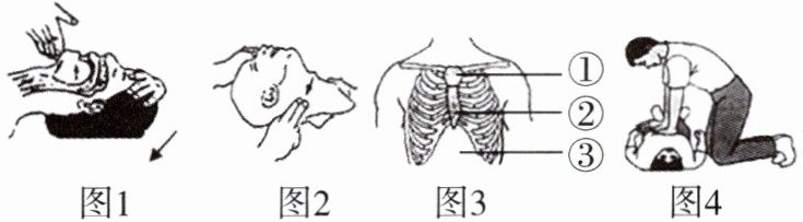 的情况,判断有无心跳。(4)图3中胸外按压的正确部位是[