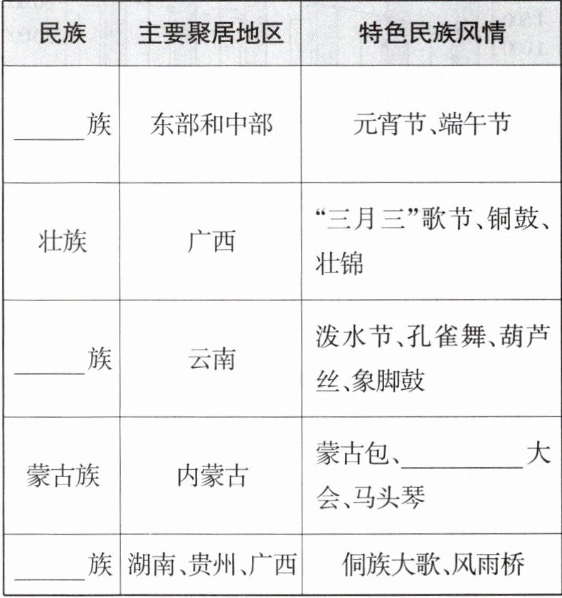 二、A维吾尔族——新疆维吾尔自治区 B傣族——云南省 C蒙古族——内蒙古自治区 D朝鲜族——吉林省