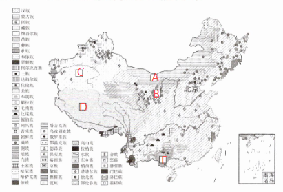 族人口最多。2.用字母A、B、C、D、E分别表示内蒙古自治区、宁夏回族自治区、新疆维吾尔自治区、西藏自治区、广西壮族自治区,并填写在图中相应位置。
