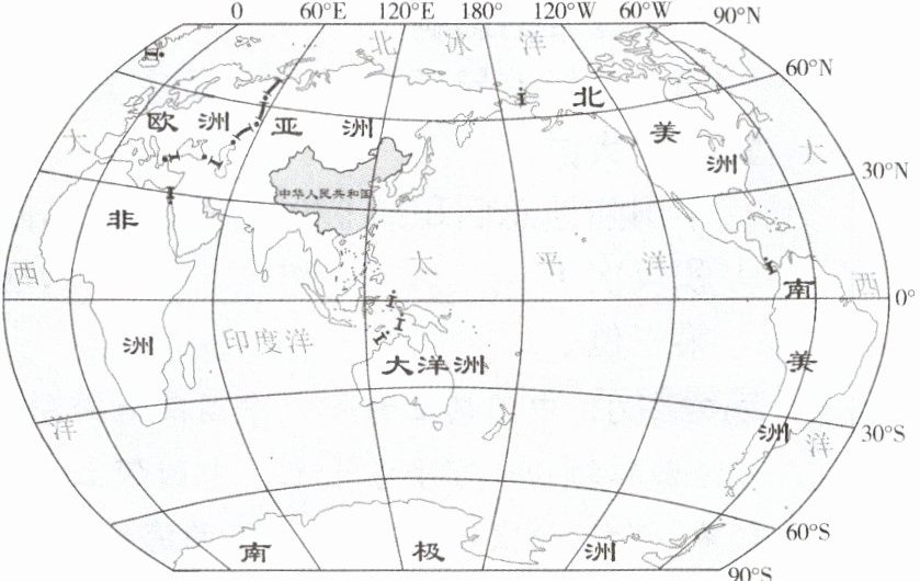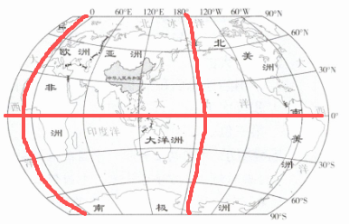 在图中用彩笔描出赤道、20°W和160°E的位置,并判断中国所处的半球位置。