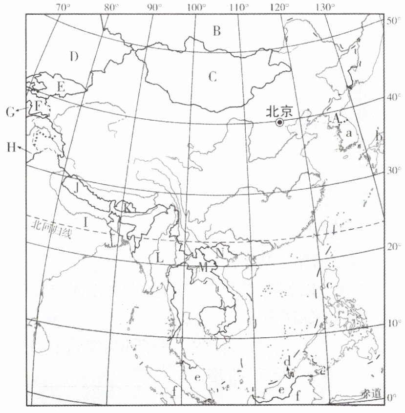 2.写出下列字母代表的与中国隔海相望的国家的名称。
