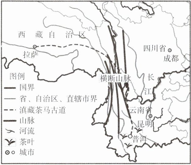 3.综合思维 横断山脉因“横断”东西间交通而得名,古代普洱产茶,藏区产马,滇藏茶马古道跨越横断山区连接东西。读横断山脉及周边地区简图,完成下列问题。