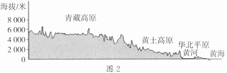 地理实践力 某校学生在地理实践活动课上,用泡沫板制作中国地形的简易立体模型(图1)。他们参照中国地势剖面图,巧妙利用不同层数的泡沫板来展示中国呈阶梯状的地势特征(图2)。读图,完成1~2题。