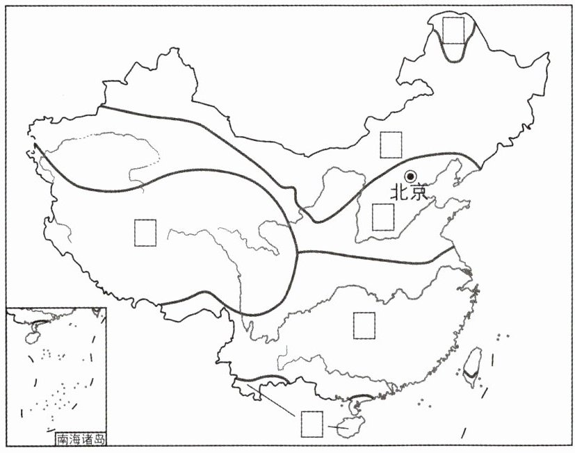 1. 在图中方框内填写相应序号:①寒温带、②中温带、③暖温带、④亚热带、⑤热带、⑥高原气候区。