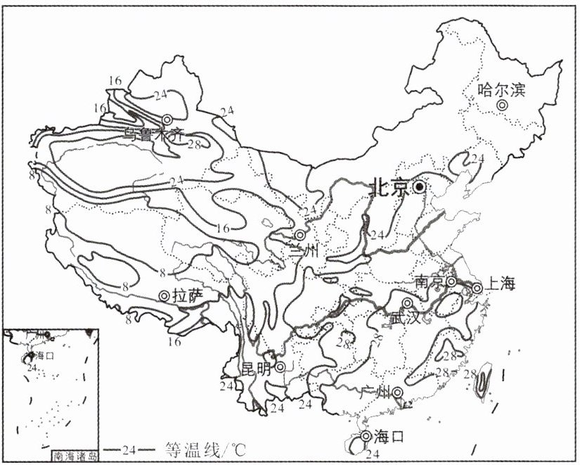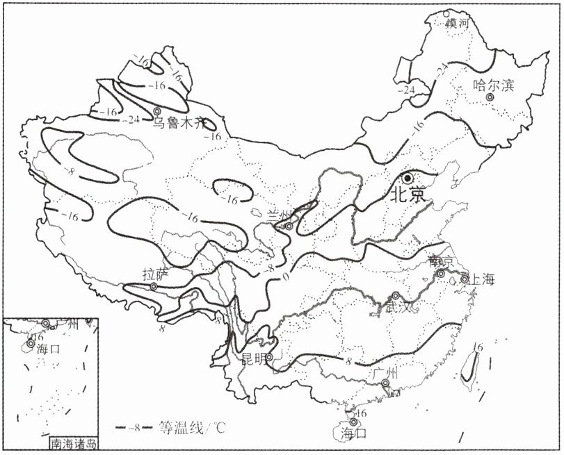 1. 在图中描出我国7月8℃等温线,并在适当位置用字母A标注青藏高原。