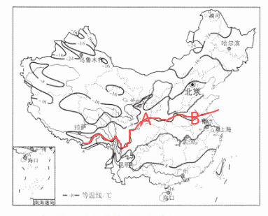 1. 在图中描出我国1月0℃等温线,并用A、B分别标注秦岭、淮河的大致位置。