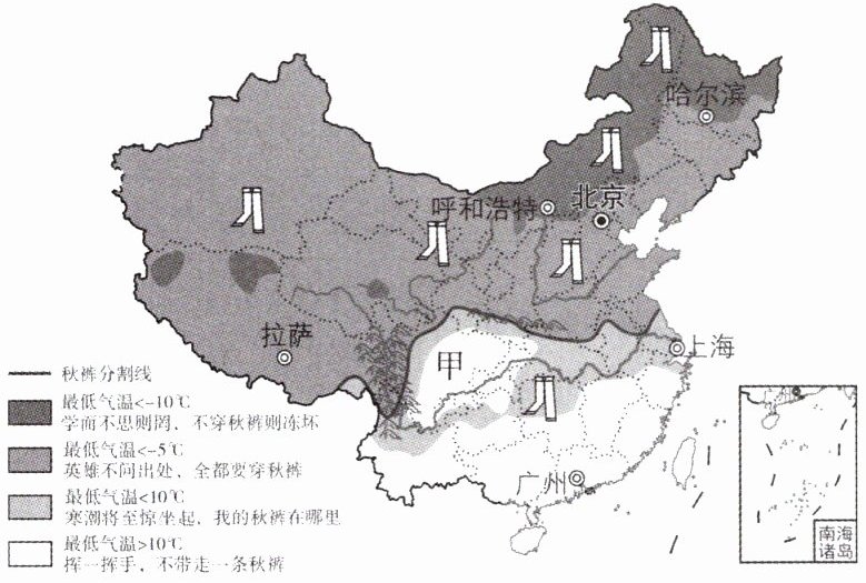 3. “穿衣”是气候在人们生活中刻上的印记。下图为中国天气网发布的“秋裤预警地图”。读图,完成下列问题。