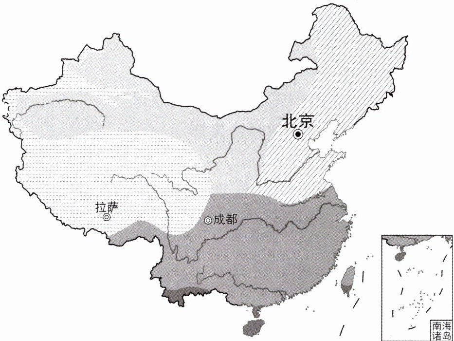 2.在图中描出温带季风气候和亚热带季风气候的分界线。