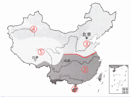 1.在图中相应位置标注代表我国主要气候类型的序号:①热带季风气候,②亚热带季风气候,③温带季风气候,④温带大陆性气候,⑤高原山地气候。