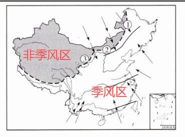 1.在图中适当位置标注“季风区”与“非季风区”。