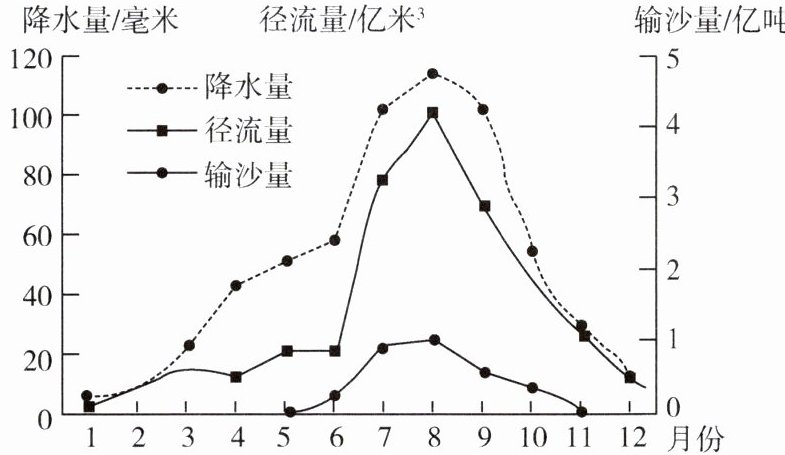 跨学科·数学 读我国某河流中游水文观测站的多年月平均降水量、径流量、输沙量变化示意图,完成1~2题。