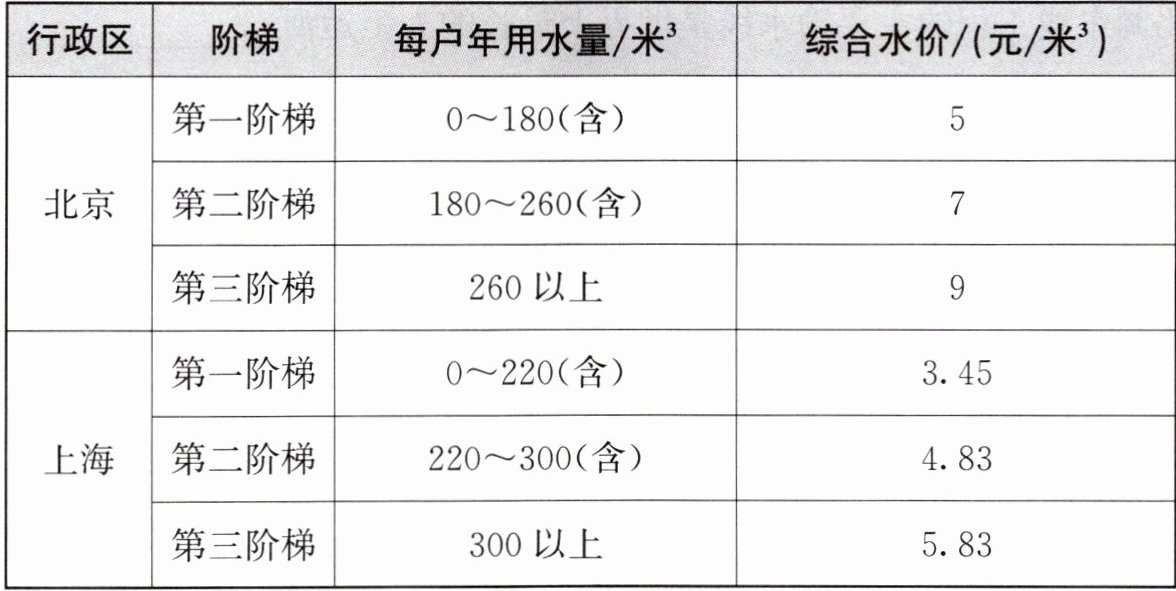 例1 目前,我国大部分地区的居民生活用水实行阶梯水价政策。读北京市和上海市2022年居民用水价格表,完成下列问题。