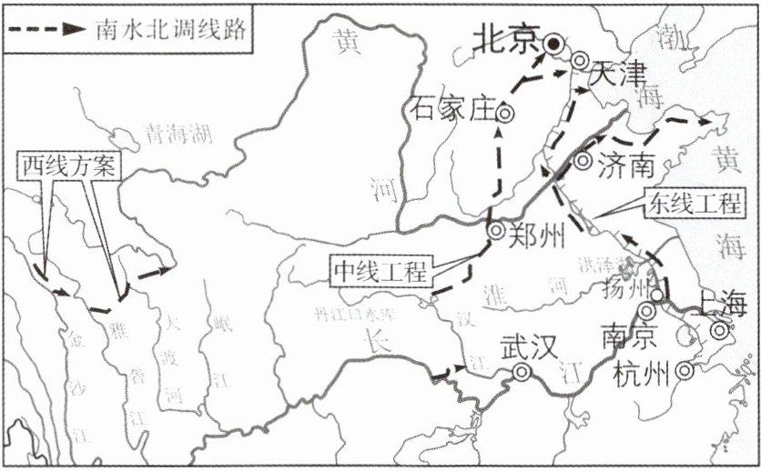 华北地区耕地占全国的40%,而水资源仅占全国的6%,且降水集中于夏季,冬春降水少,春旱严重。华北地区人口众多,工农业及生活用水量大,淡水供应紧张。下图是我国南水北调工程线路示意图。