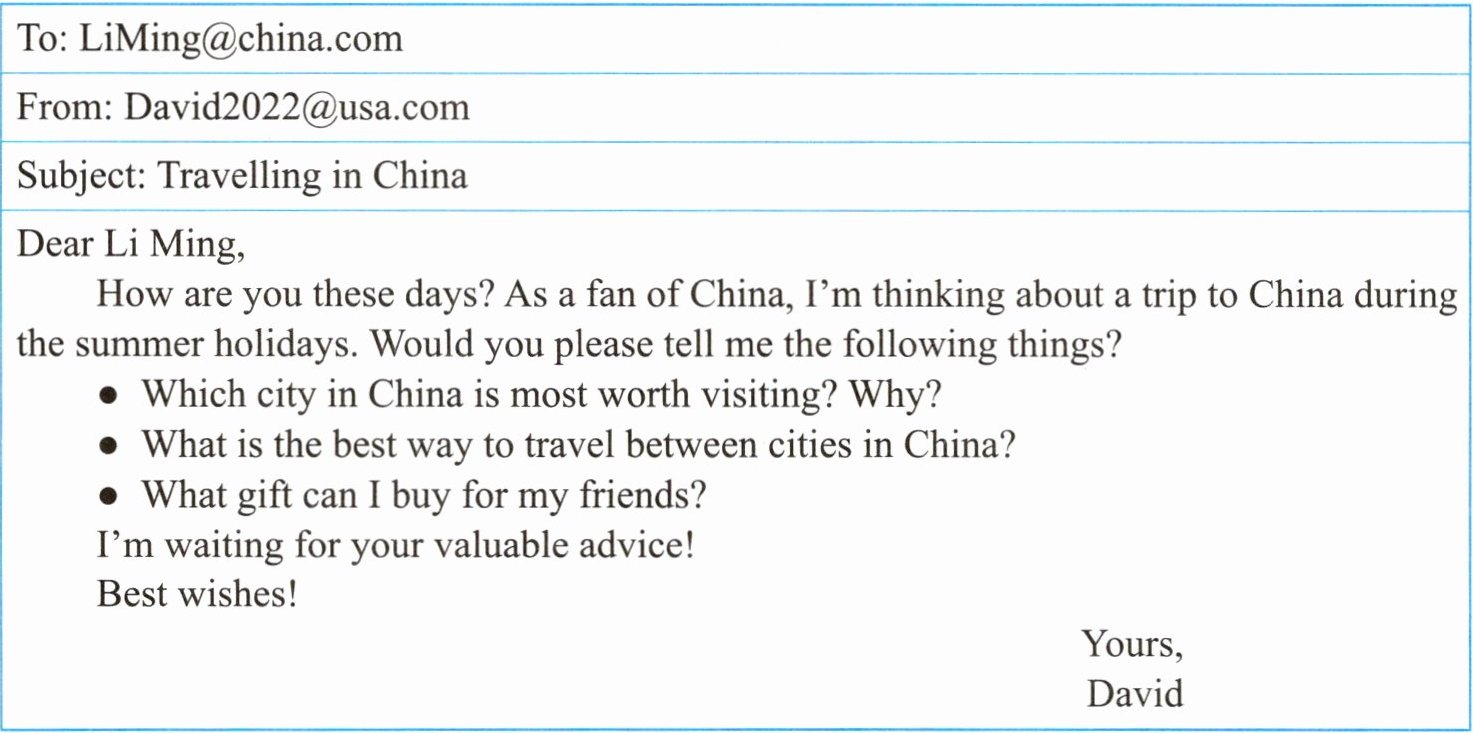 越来越多的外国友人喜欢来中国旅游。假定你是李明,你的美国笔友戴维是一个中国迷,他想来中国进行深度旅游。请你阅读他写给你的邮件,并根据邮件内容及你对中国的了解用英语回复。须包括所有要点,可适当发挥,词数90左右。