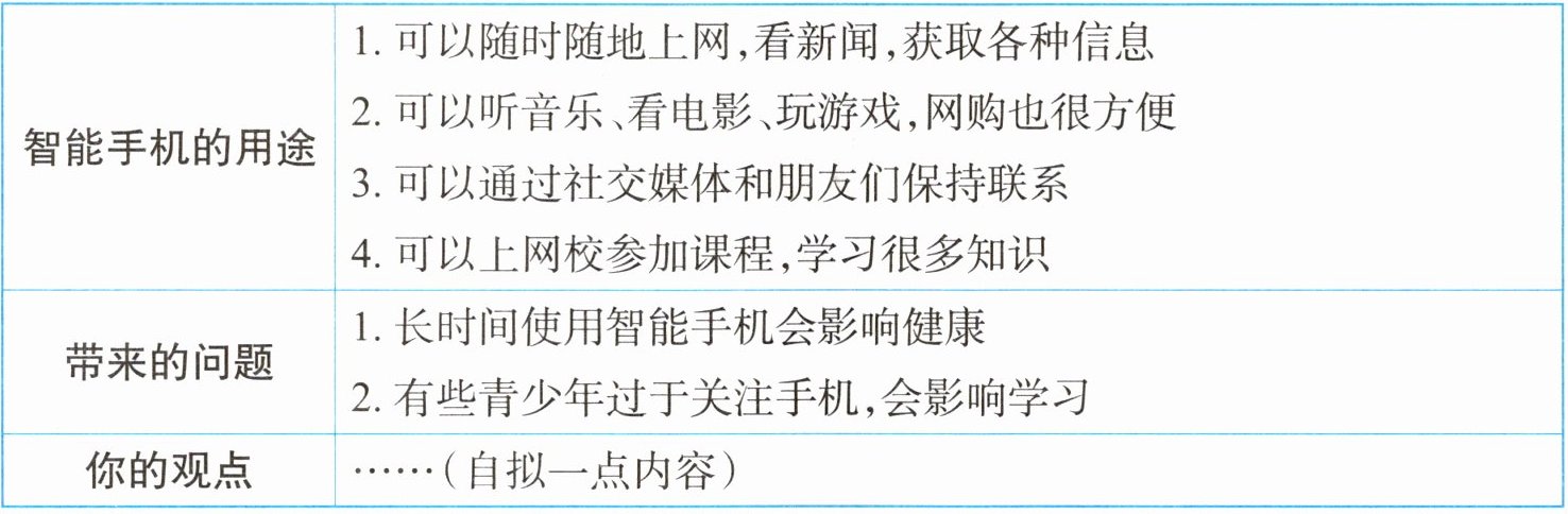 智能手机在我们的日常生活中越来越受欢迎,它给人们的生活带来了很多便利,但同时也带来了很多问题。你班就此问题展开了讨论。请根据以下讨论结果用英文写一篇报告。