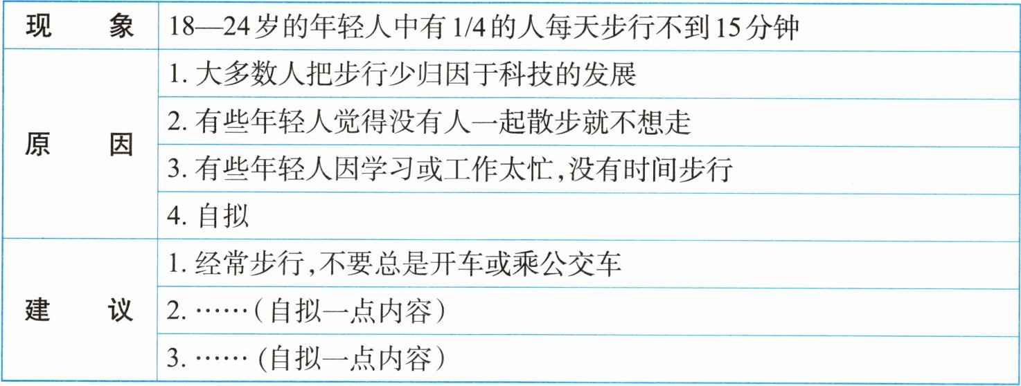 科学家通过问卷调查发现,现在的年轻人走路很少。请你根据下面的问卷结果写一篇英语短文,以提醒身边的人们要重视运动,关注健康。