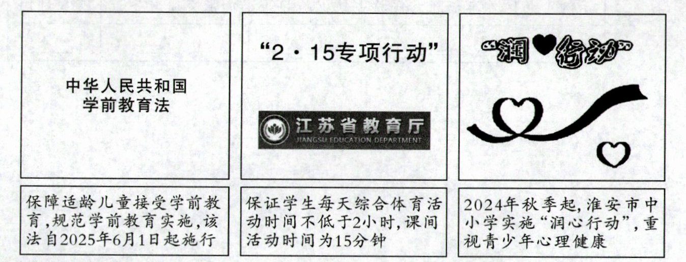 1.A 解析 本题考查保持身心健康。根据板块内容,《中华人民共和国学前教育法》保障适龄儿童接受学前教育,“2·15专项行动”保证学生体育活动及课间活动时间,“润心行动”的实施,体现淮安市重视青少年心理健康,这些内容都围绕着保护未成年人的成长与健康展开。A既体现了法律(学前教育法)对生命成长的守护,又涵盖了题干中体育活动和心理健康对身心健康的滋润,符合题意;题干中板块内容未着重体现生命价值的充盈和精神需求的满足,B不符合题意;题干中板块内容未涉及生命永恒和积极奉献社会,C不符合题意;题干中板块内容强调的重点展现的是未成年人保护,而非一般的规则保障秩序、创建美好生活,D不符合题意。