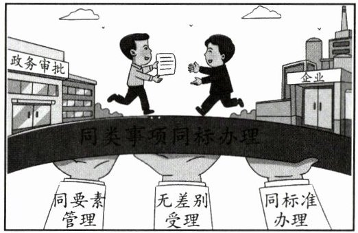 漫画中没有涉及法治与自由、权利与责任的关系,A、B不符合题意;漫画说明同类事项同标办理,体现出同等情况同等对待,C符合题意;漫画中的同要素、无差别、同标准都体现的是同等情况,而不是对不同情况的差别处理,D不符合题意。