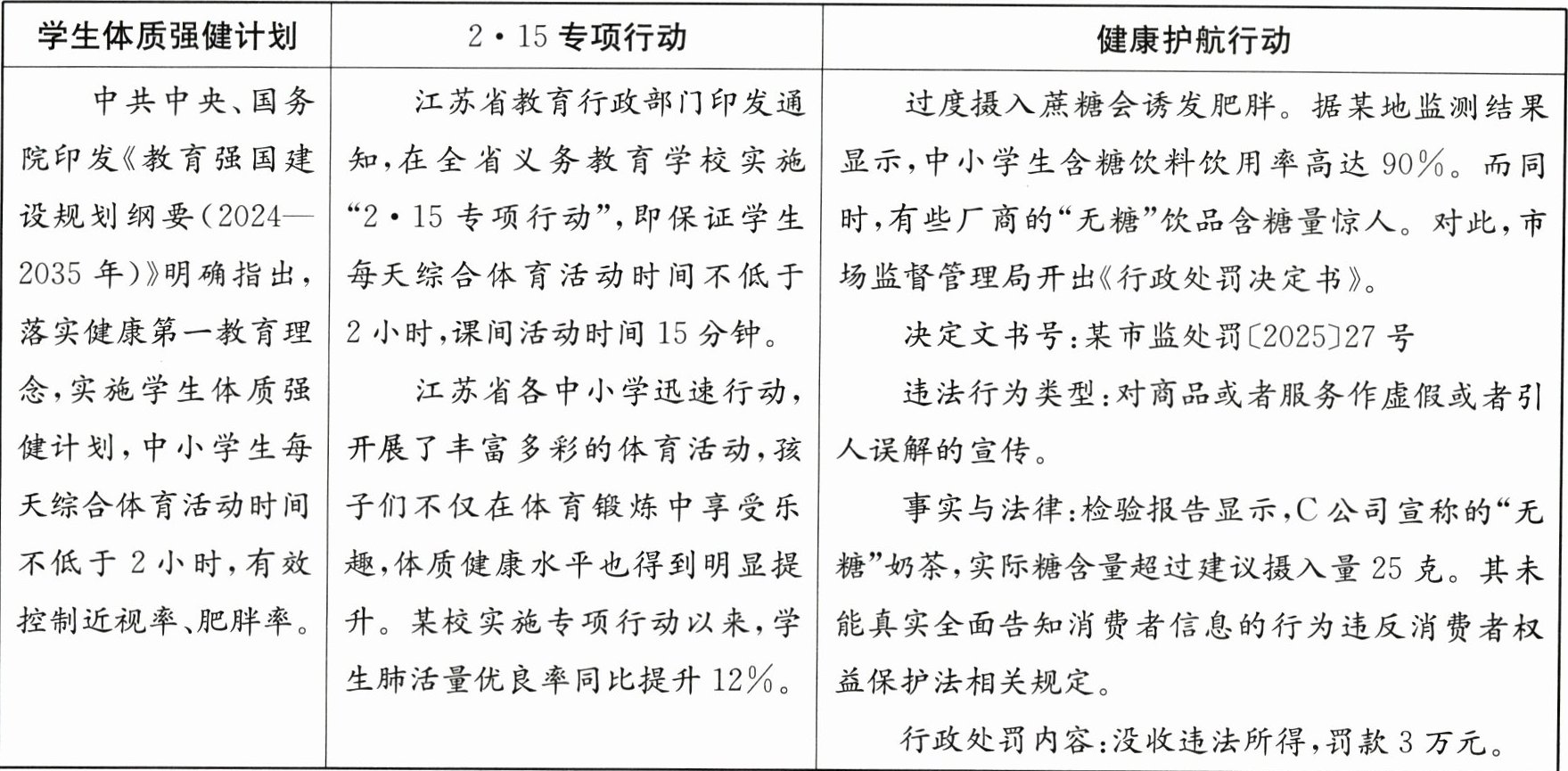 (1)问,江苏省教育行政部门印发通知,在全省义务教育学校实施“2·15专项行动”体现我国实行民主集中制的原则。中共中央、国务院印发《教育强国建设规划纲要(2024—2035年)》体现党是领导一切的;国务院是我国最高行政机关,统一领导地方各级人民政府。江苏省各中小学迅速行动,开展了丰富多彩的体育活动,市场监督管理局开出《行政处罚决定书》体现江
