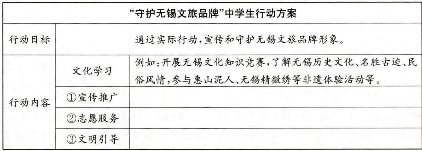(3)问要求完善“守护无锡文旅品牌”中学生行动方案,属于开放性试题,围绕“行动内容”言之有理即可。
