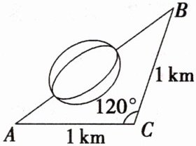 4.$\sqrt{3}$ 在$\triangle ABC$中,易得$A = 30^{\circ}$,由正弦定理$\frac{AB}{\sin C} = \frac{BC}{\sin A}$,得$AB = \frac{BC\sin C}{\sin A} = \frac{2×1×\frac{\sqrt{3}}{2}}{\frac{1}{2}} = \sqrt{3} km$。