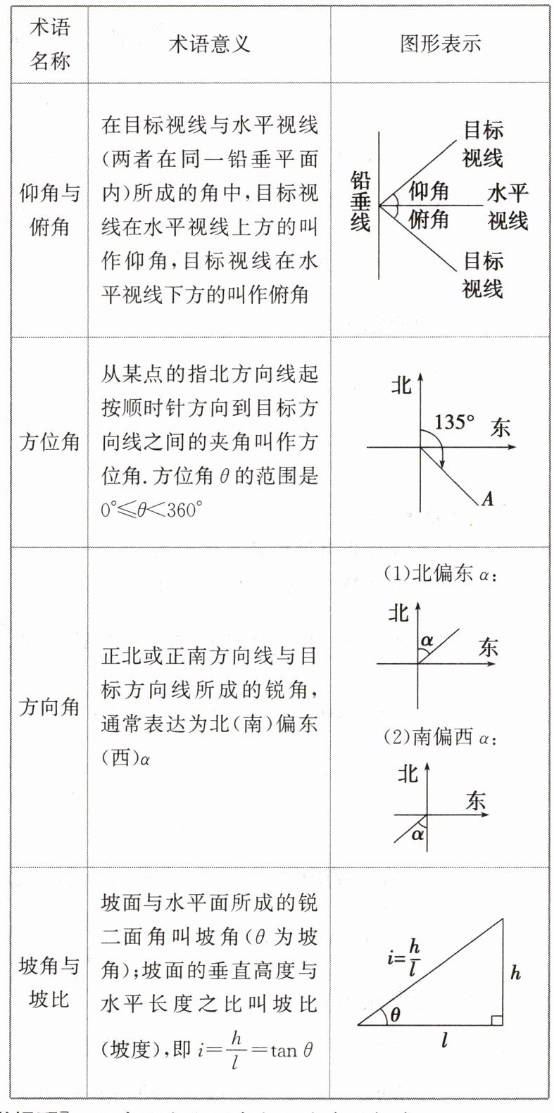 术语意义:在目标视线与水平视线(两者在同一铅垂平面内)所成的角中,目标视线在水平视线上方的叫作仰角,目标视线在水平视线下方的叫作俯角。