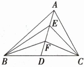2. 如图,在$\triangle ABC$中,$D$是$BC$的中点,$E$,$F$是$AD$上的两个三等分点。$\overrightarrow{BA} · \overrightarrow{CA} = 4$,$\overrightarrow{BF} · \overrightarrow{CF} = -1$,则$\overrightarrow{BE} · \overrightarrow{CE}$的值为