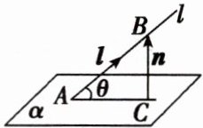 已知直线$l$为平面$\alpha$的斜线,$l \cap \alpha = A$,$\boldsymbol{l}$为$l$的方向向量,$\boldsymbol{n}$为平面$\alpha$的一个法向量,$\theta$为$l$与$\alpha$的夹角。