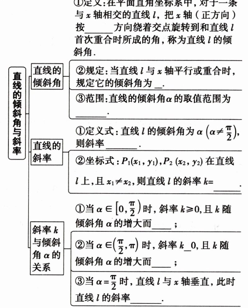 1.逆时针 0 $[0, \pi)$ $k = \tan \alpha$ $\frac{y_2 - y_1}{x_2 - x_1}$ 增大 < 增大 不存在