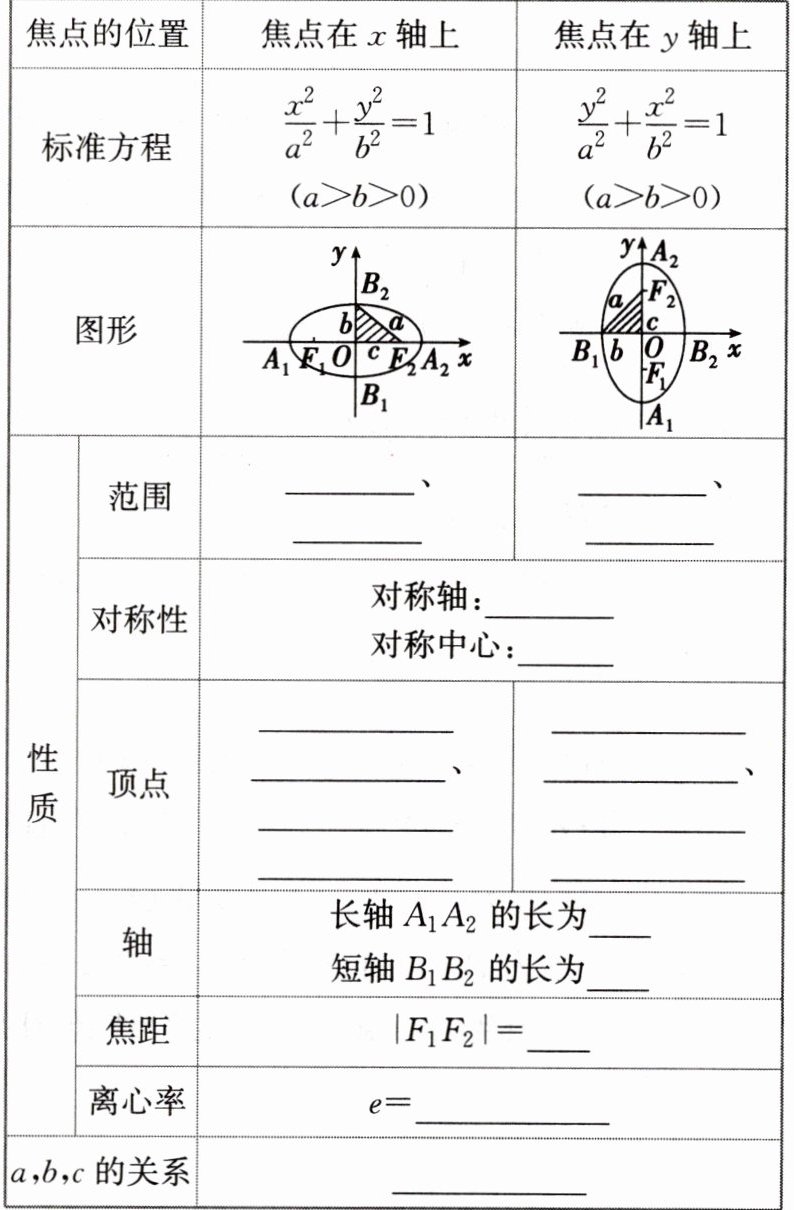 [微提醒] (1)焦点在$x$轴上$\Leftrightarrow$标准方程中$x^2$项的分母较大;焦点在$y$轴上$\Leftrightarrow$标准方程中$y^2$项的分母较大.