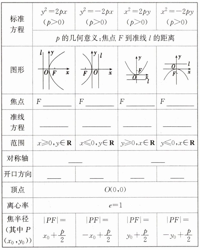 $(\frac{p}{2},0)\ \ (-\frac{p}{2},0)\ \ (0,\frac{p}{2})$ $(0,-\frac{p}{2})\ \ x=-\frac{p}{2}\ \ x=\frac{p}{2}\ \ y=-\frac{p}{2}\ \ y=\frac{p}{2}$ x轴 y轴 向右 向左 向上 向下