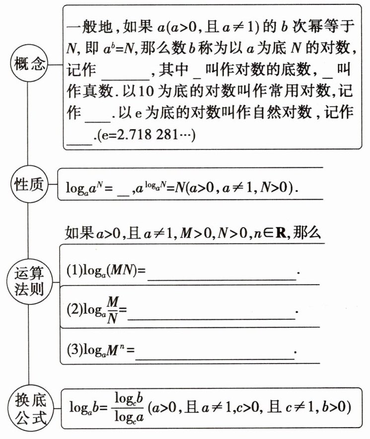 $\log_{a}N = b \Leftrightarrow a \quad \mathrm{N} \lg N \ \ln \mathrm{N}$ $\log_{a}M + \log_{a}N \log_{a}M - \log_{a}N \ n\log_{a}M$